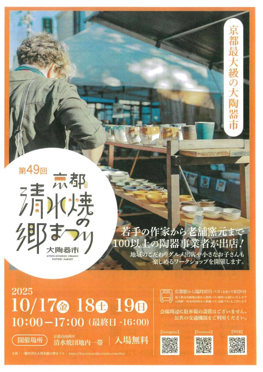 そんな『清水焼団地』周辺では、来たる10/17・18・19日(金・土・日)に、現在も60以上のものづくりに携わる方々が加盟している『清水焼団地協同組合』が毎年協賛して開催される『陶器まつり』が、今年も盛大に開催されます!100以上の陶器事業者が出店予定で、実際に団地内で製造された陶器がお手頃価格で販売されたり、グルメショップやワークショップもあるようで、地元京都だけではなく他府県からも毎年多くの来場者があり、陶器好きにはたまらなく楽しいイベントになるようです。来年50回目の節目を迎えるこのお祭りですが、最寄り駅からの徒歩による来場はちょっと距離があって大変ですが、地下鉄『椥辻』駅や『東野』駅から無料循環バスが15分に1本運行されるようですので是非ご利用の上ご来場ください。